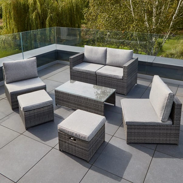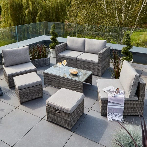 Perfect for relaxing in style, this stylish grey Cancun Modular Set is stylish and comfortable. Boasting a unique rattan design, this set includes plush cushions and footrests for added comfort. This set is beautifully crafted from rattan, steel, and glass for a robust and low maintenance finish. The footstools in this set can be used as extra seating.