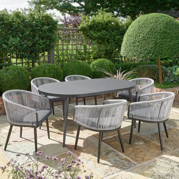 This 6 seater dining set is perfect for outdoor spaces. Featuring an aluminum frame and an oval shape glass table top, this is the ultimate outdoor furniture for any home. The contemporary design and colour option make this an amazing addition to any garden or patio!