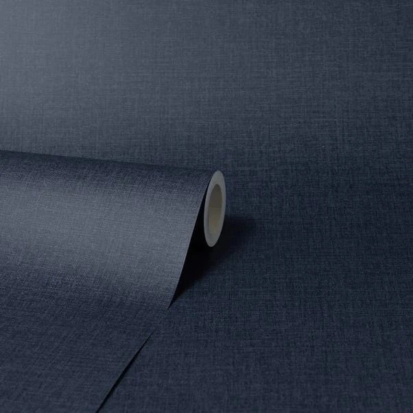 The Luna navy wallpaper features a stylish linen textured design in a traditional smooth matt finish, perfect for bringing a cosy feel to your home.