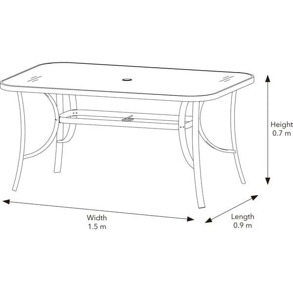 | Product Dimensions | Dining Table: H 70cm x W 150cm x L 90cmChair: H 98cm x W 55cm x D 74cmFootstools: H 34cm x W 43cm x D 49cmSide Table: H 46cm x Dia. 51cmParasol: H 230cm x Dia. 236-245cm |