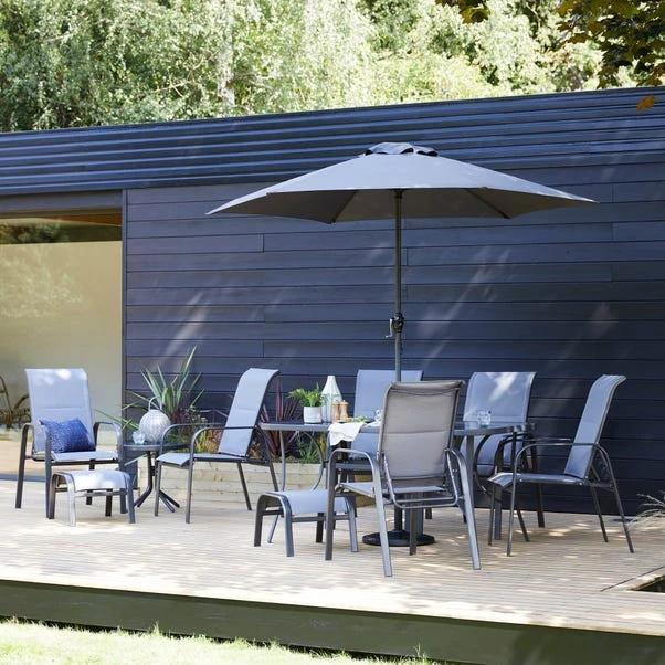 | Pack Contents | 1 x Table, 1 x Side Table, 6 x Chairs, 2 x Stools, 1 x Parasol |