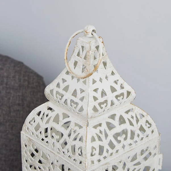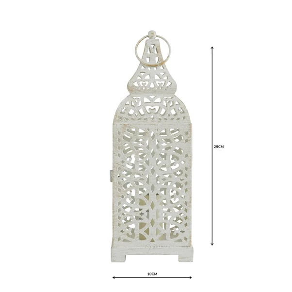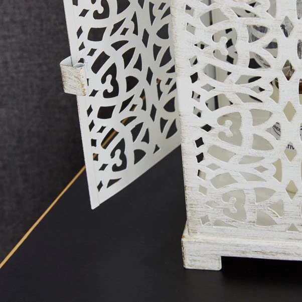 Designed in a lantern shape with intricate cut out detailing, our cream table lamp will add an exotic touch to your interior, with its Moroccan inspired style. A glowing candle placed in the lamp will provide a radiant illumination and the lamp is ideal for lighting up dark corners.