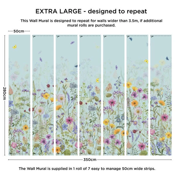 Transform a dull boring room into a flourishing field of fresh spring flowers with this delightful floral scene in a gentle duck egg blue colourway, featuring colourful detailed flowers on a smooth finish non-woven paper in a matte ink design. Available in a medium, large and extra-large size option, this spectacular design can transform your home depending on your chosen scale to create a fabulous attraction while the easy to use paste the wall application gives you the ability to remove the strip in one go and involves less mess compared to traditional paste the paper application as no pasting table is required.